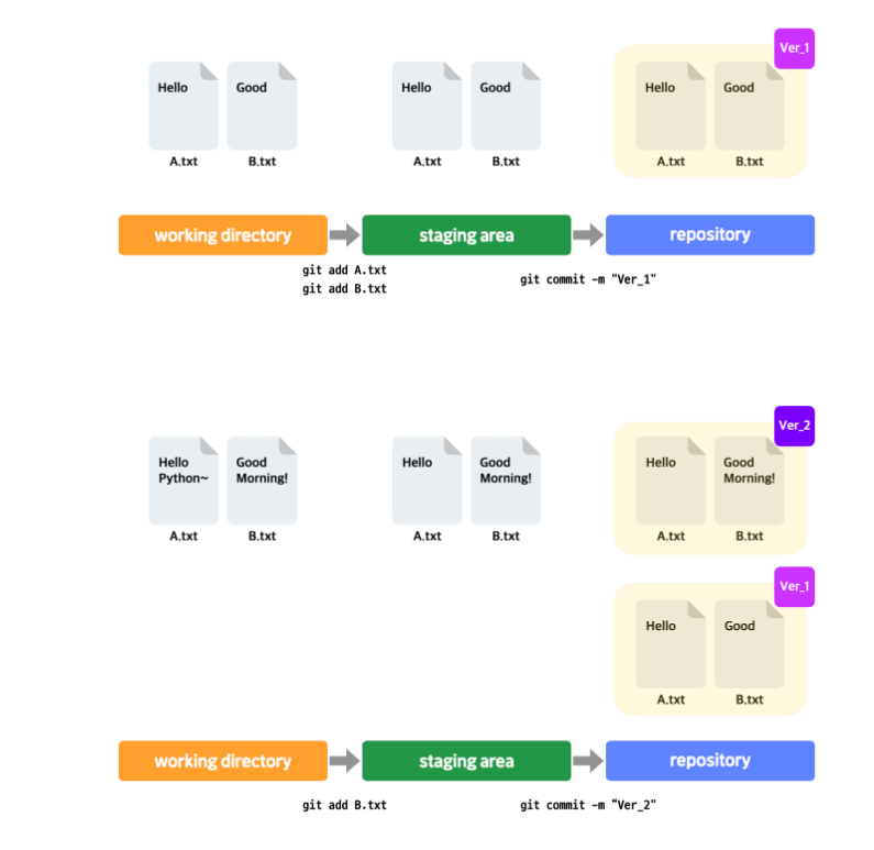 - git 사용시 숨겨진 .git 디렉토리가 생성되는데, 이것을 레포지토리라 한다 (각 버전의 변경사항이 저장된다)