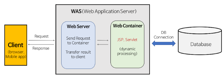 | HTTP 프로토콜 기반으로 클라이언트의 요청을 처리한다 | 웹 서버의 기능을 포함하며 추가로 에플리케이션 서버와 DB 연동 기능을 제공한다 |