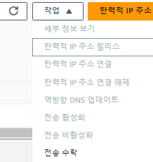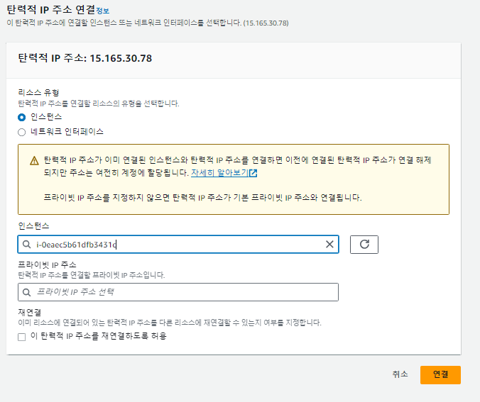 이전에 퍼블링 ip 자동 할당을 했기 때문에 현제 ip 가 할당되어 있지만, EC2를 재시작 할 경우, ip 주소가 바뀌게 된다. EC2가 꺼지더라도 바뀌지 않도록 하는것이 탄력적 IP 이다.