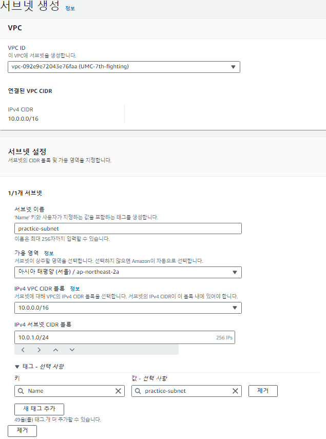 방금 생성한 서브넷을 선택하고, 서브넷 이름을 생성. 그 후, CIDR 을 10.0.1.0/24 로 생성한다.