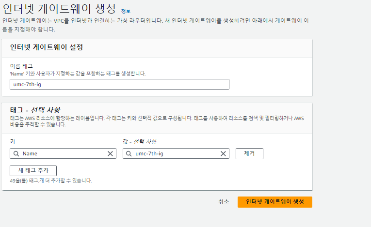 생성완료 후, 이제 인터넷 게이트웨이를 생성해야 한다
