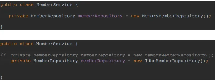 - 이전에 든 예시의 MemberService 는 interface 에 의존하지만, 구현 클래스도 동시에 의존한다.. DIP 위반