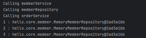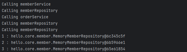 λΆλͺ memberService μμλ, orderService μμλ memberRepository λ©μλλ₯Ό ν΅ν new ν€μλλ₯Ό μ¬μ©νκΈ°μ, “Calling memberRepository” κ° 3λ² μΆλ ₯λμ΄μΌ ν κ² κ°λ€. νμ§λ§ κ²°κ³Όλ λ€μκ³Ό κ°λ€