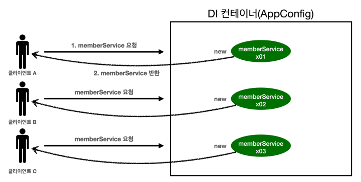 μ΄ ν μ€νΈμ μλ―Έλ, μμν DI ContainerμΈ AppConfigλ μμ²λ§λ€ κ°μ²΄λ₯Ό μλ‘ μμ±νλ€. λ¬Όλ‘ μμ² μκ° μ λ€λ©΄ μκ΄ μμ κ²μ΄λ€. νμ§λ§, λ§μ½ κ³ κ° νΈλν½μ΄ μ΄λΉ 100μ΄λΌλ©΄, μ΄λΉ 100κ°μ κ°μ²΄κ° μμ±λκ³ μλ©Έλλλ°, λ©λͺ¨λ¦¬ λλΉκ° λ§€μ° μ¬νλ€.