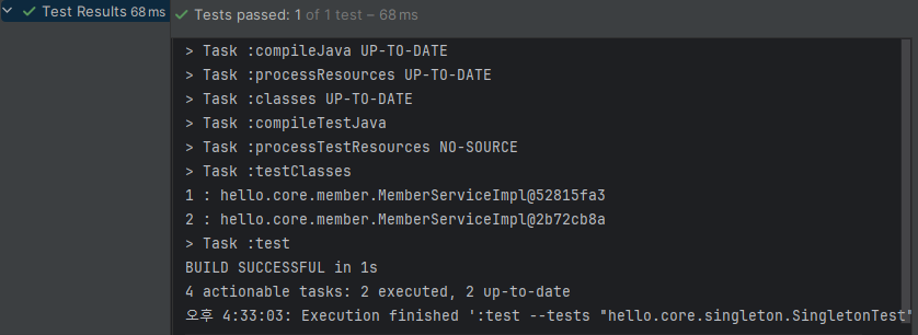 μ΄μ ν μ€νΈλ μ§μ μμ±ν μ±κΈν€ ν΄λμ€μ ν μ€νΈμλ€. μ΄λ² ν μ€νΈλ Spring Container μ λ±λ‘λμ΄ μ»¨ν μ΄λκ° bean λ€μ μ±κΈν€μΌλ‘ κ΄λ¦¬νλμ§ κ²μ¦νκΈ° μν ν μ€νΈμ΄λ€. μ°Έμ‘°κ°λ κ°κ³ ν μ€νΈλ ν΅κ³Όνλ€.