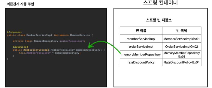 @Autowired 가 지정되어 있으면, 스프링 컨테이너가 자동으로 해당 스프링 빈을 찾아서 주입한다. 기본 조회 전략은 타입이 같은 bean 을 찾아 주입하는 것이다.