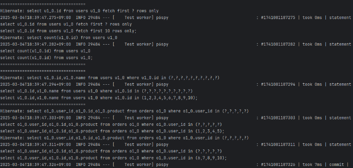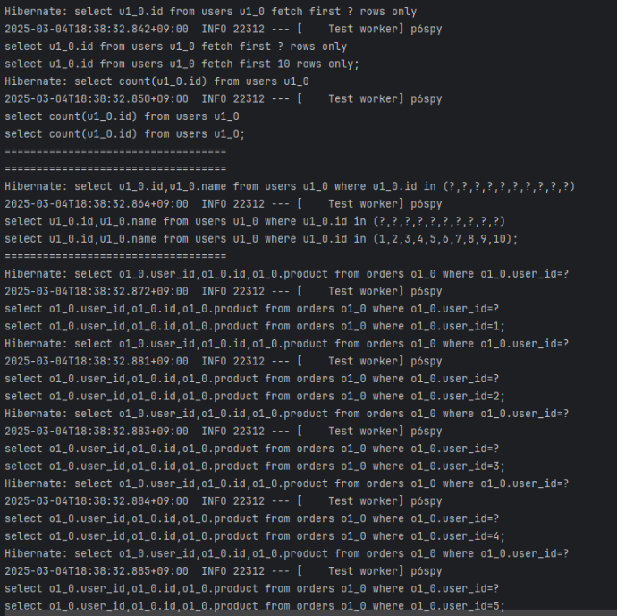 - orders 조회: @BatchSize에 의해 IN 쿼리로 한 번에 처리 (1번 쿼리).