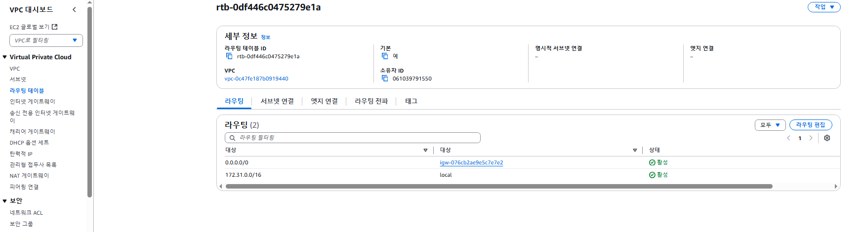또한 이전에 보았던 기본 VPC 주소가 있는데, 대상이 local 로 되어 있다. 이는 동일한 VPC 내의 서브넷간 통신이 가능하다는 뜻이다. 즉, 같은 VPC 내부에 있다면 서로 통신이 가능하다.