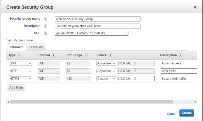 VPC 내부에서 트레픽이 Elastic Network Interface 를 통해 들어올 때, 이 Security Group 의 규칙을 적용한다. 다중 보안 그룹을 하나의 인스턴스에 적용할 수도 있고, 이들의 규칙은 OR 조건으로 병합되어 동작한다.