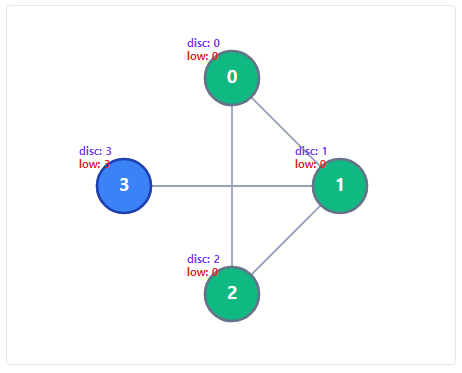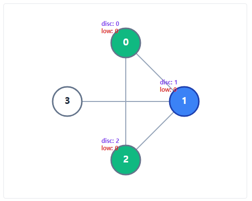 2번 노드는 이미 방문한 노드인 0번 노드의 disc 값과, 자신의 low 를 비교하여 자신의 low 를 업데이트 한다. 이러한 결과는 1번 노드까지 전파된다.