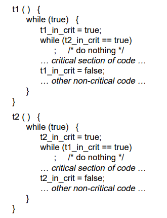 - 가정: 각 사람(스레드)가 각자의 igloo를 보유하고 있다, 각 스레드가 각자의 칠판을 확인하고 변경할 수 있다. 스레드는 다른 스레드의 칠판을 확인할 수 있지만 변경은 불가, 칠판에 'true'가 적혀있을시 critical section 접근