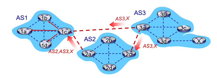 > AS2 router 2c는 AS3,X를 AS3 router 3a로부터 받는다