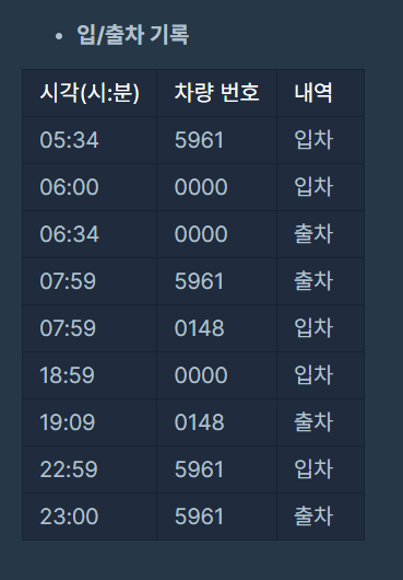 - 형식은 [시각 차량번호 IN/OUT] 이다