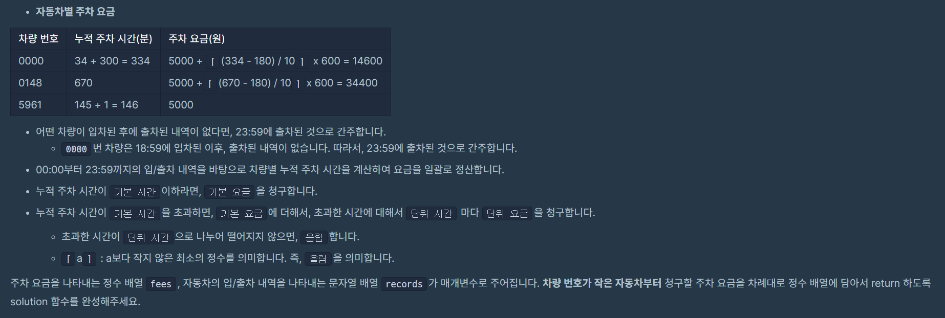 - 입차기록이 있지만 출차 기록이 없다면 23:59분에 출차한 것으로 간주한다