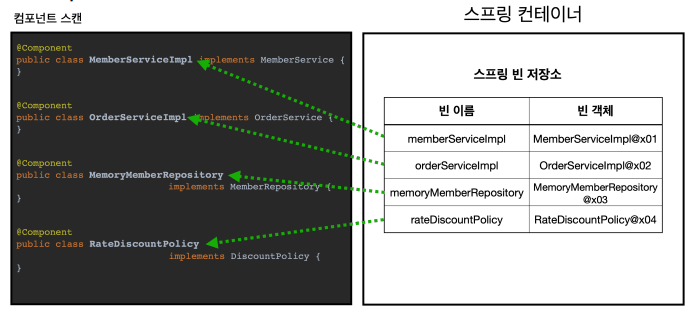 @ComponentScan 을 사용하게 되면, @Component 어노테이션이 붙은 클래스를 스캔하여 스프링 빈으로 등록하게 된다.
