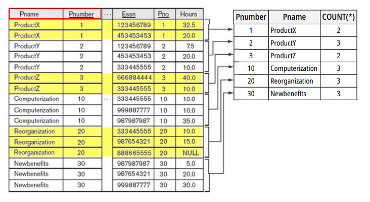 > PROJECT 테이블에서 Dnum 이 5 인요소들의 Pnumber 를 골라 해당하는 Pname 을 출력